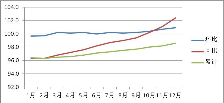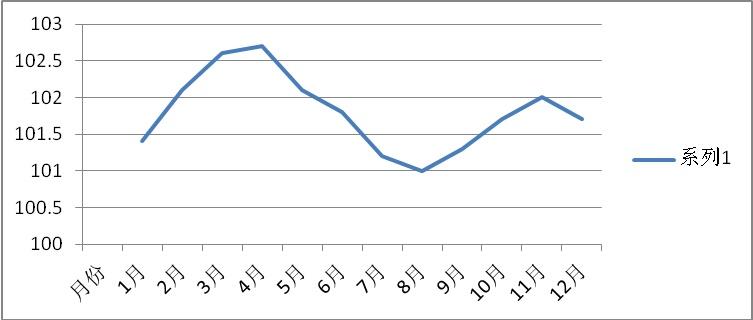 1、居民消费价格运行总体呈现年初年末较高,年中较低的M型走势。我市同比价格从2月开始小幅上涨,4月份冲高到2.7%,5月开始回落,9月又出现上涨,至11月达到2.0%后开始回落。但整体波动幅度不大,涨幅最高为2.7%,最低为1.0%,相差1.7个百分点(见表一)。