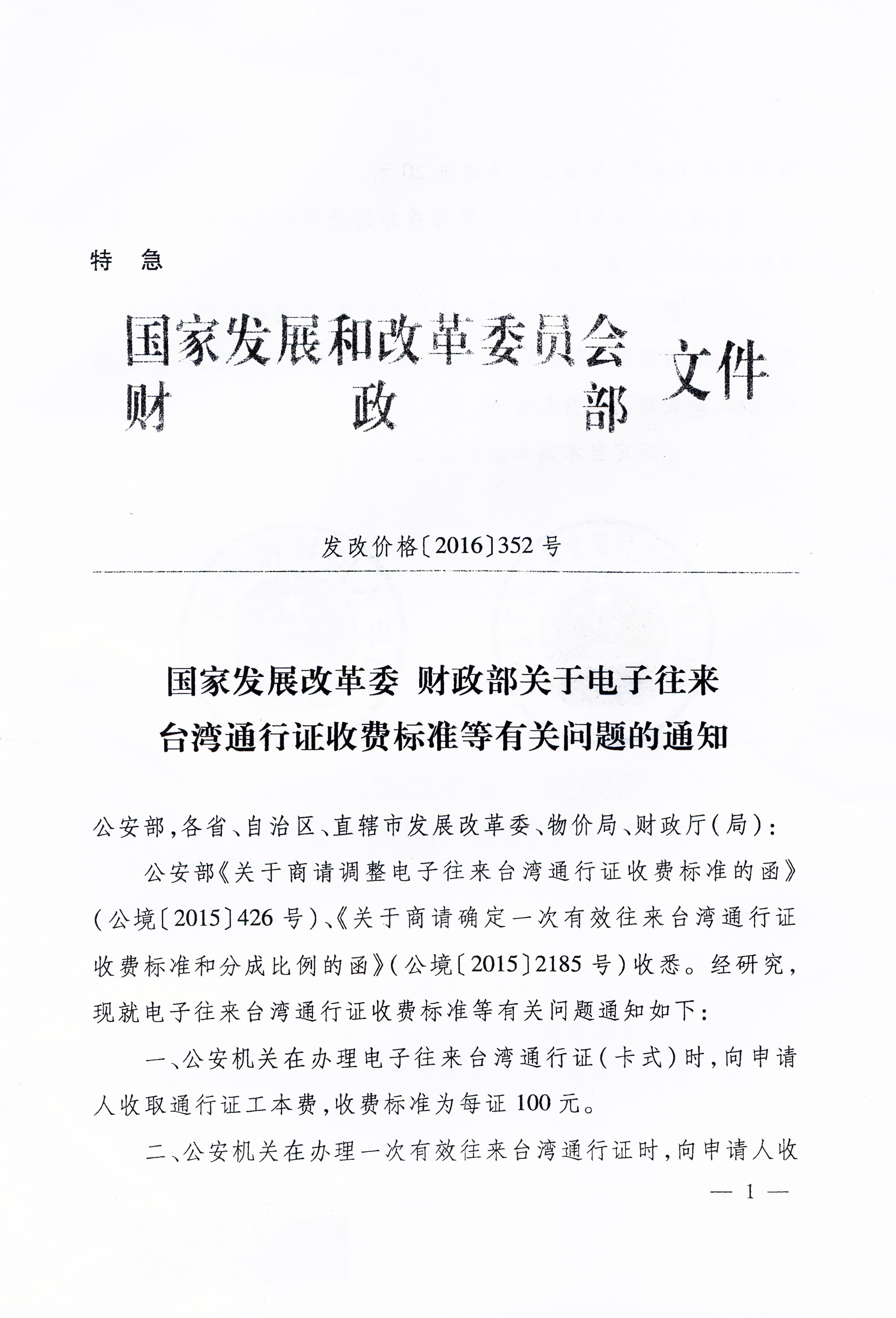 现将《国家发展改革委财政部关于电子往来台湾通行证收费标准等有关问题的通知》(发改价格〔2016〕352)转发给你们,请遵照执行。