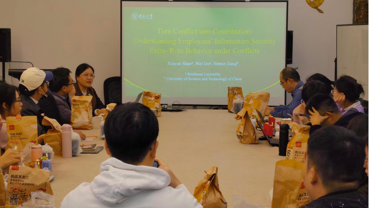 随后,邵老师以“Turn Conflict into Contribution: Understanding Employees’ Information Security Extra-Role Behavior under Conflicts”为主题,系统介绍了其团队在信息安全行为领域的最新研究成果。她指出,信息安全管理中常出现“安全-效率”两难困境,而传统研究多聚焦于员工的合规行为,忽略了其在安全实践中的主动贡献。邵老师从“任务型”与“角色型”两类信息安全冲突切入,基于交易压力理论,构建了一个包含认知评估与应对行为的理论模型,揭示了自我效能感在冲突认知与行为选择中的关键调节作用。研究通过情景实验与结构方程建模,验证了“工作塑造”作为建设性应对方式对员工信息安全额外角色行为的促进作用,为组织在制度设计、培训支持与身份整合等方面提供了实践启示。
