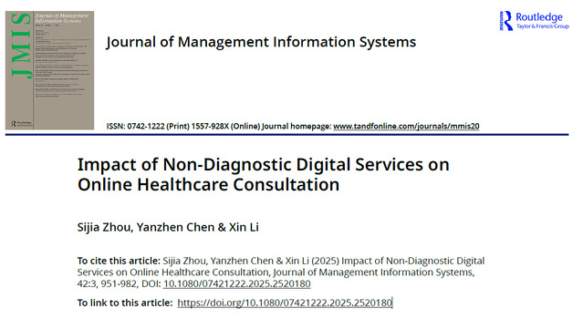 近期,经济管理学院电子商务系周思佳老师与合作者在FT50期刊《Journal of Management Information Systems》在线发表学术论文“Impact of Non-Diagnostic Digital Services on Online Healthcare Consultation”。