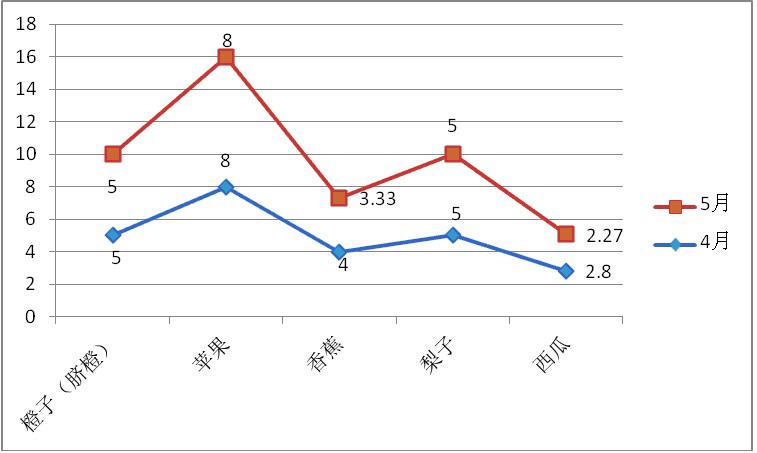 五、水果价格基本维稳,西瓜、香蕉价格现回落,其中,苹果、梨子接连数月维持“高身价”。具体价格情况参见下图(单位:元/