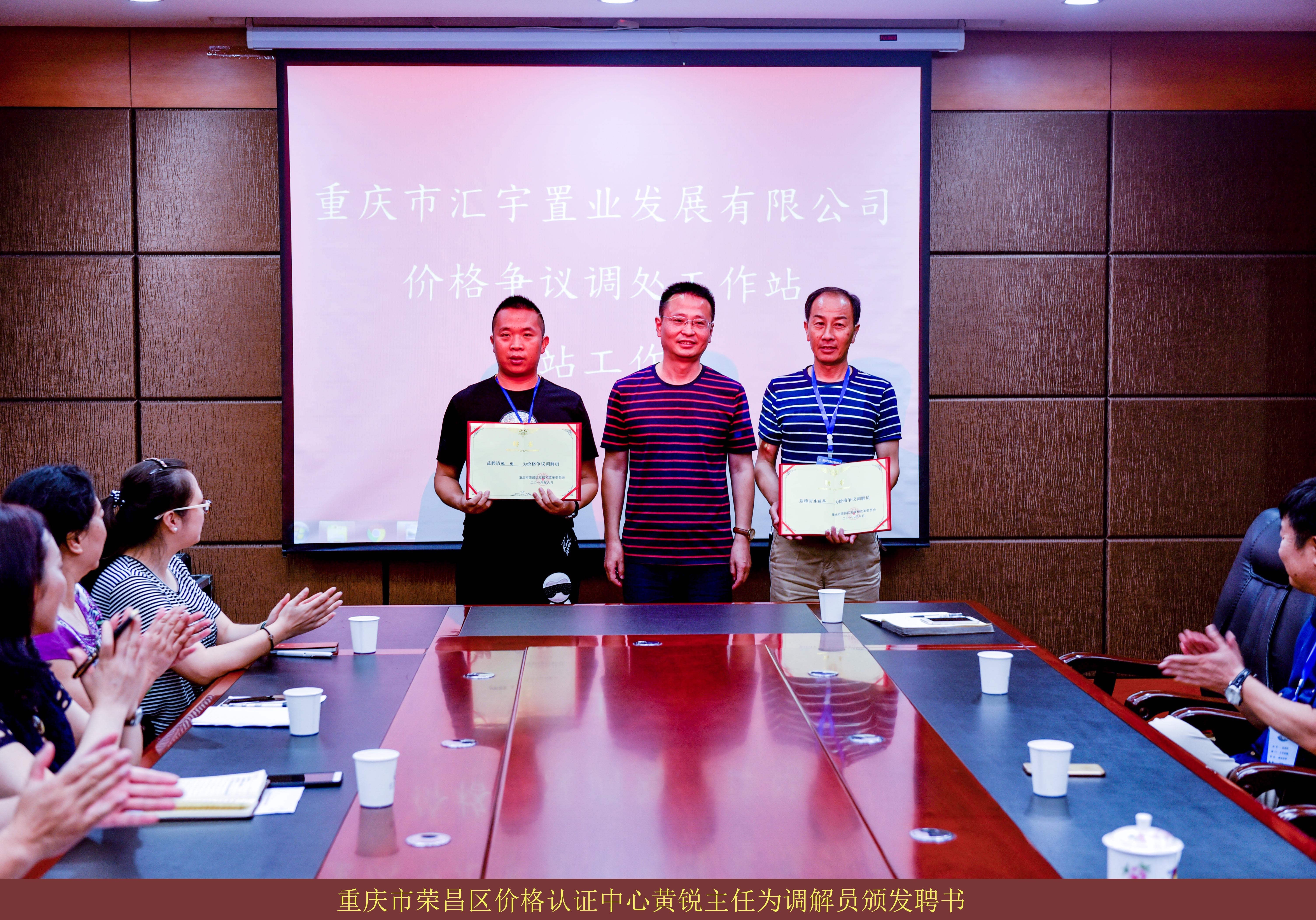 2018717日,重庆市汇宇置业有限公司会议室内,伴随着热烈的掌声,荣昌区发改委主任蒋胜为汇宇公司价格争议调处工作站授牌,区价格认证中心主任黄锐为二名价格争议调解员颁发聘书。至此,荣昌区第三个价格争议调处工作站宣告成立。