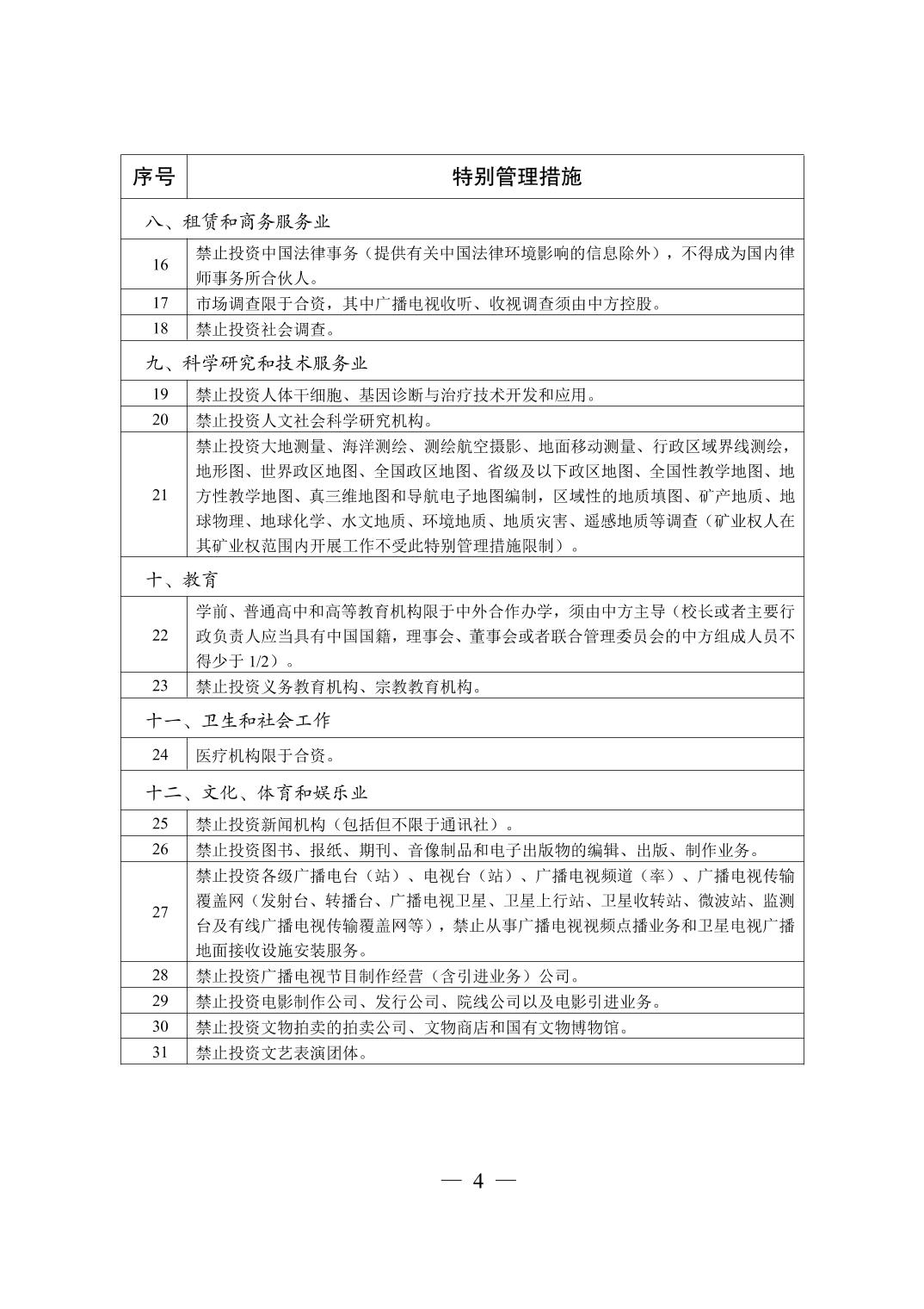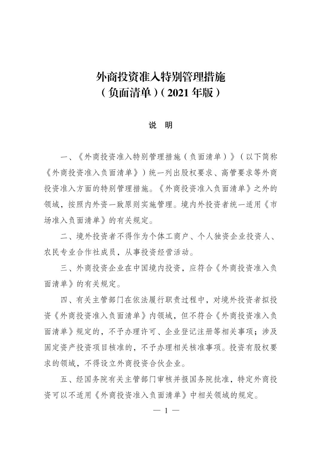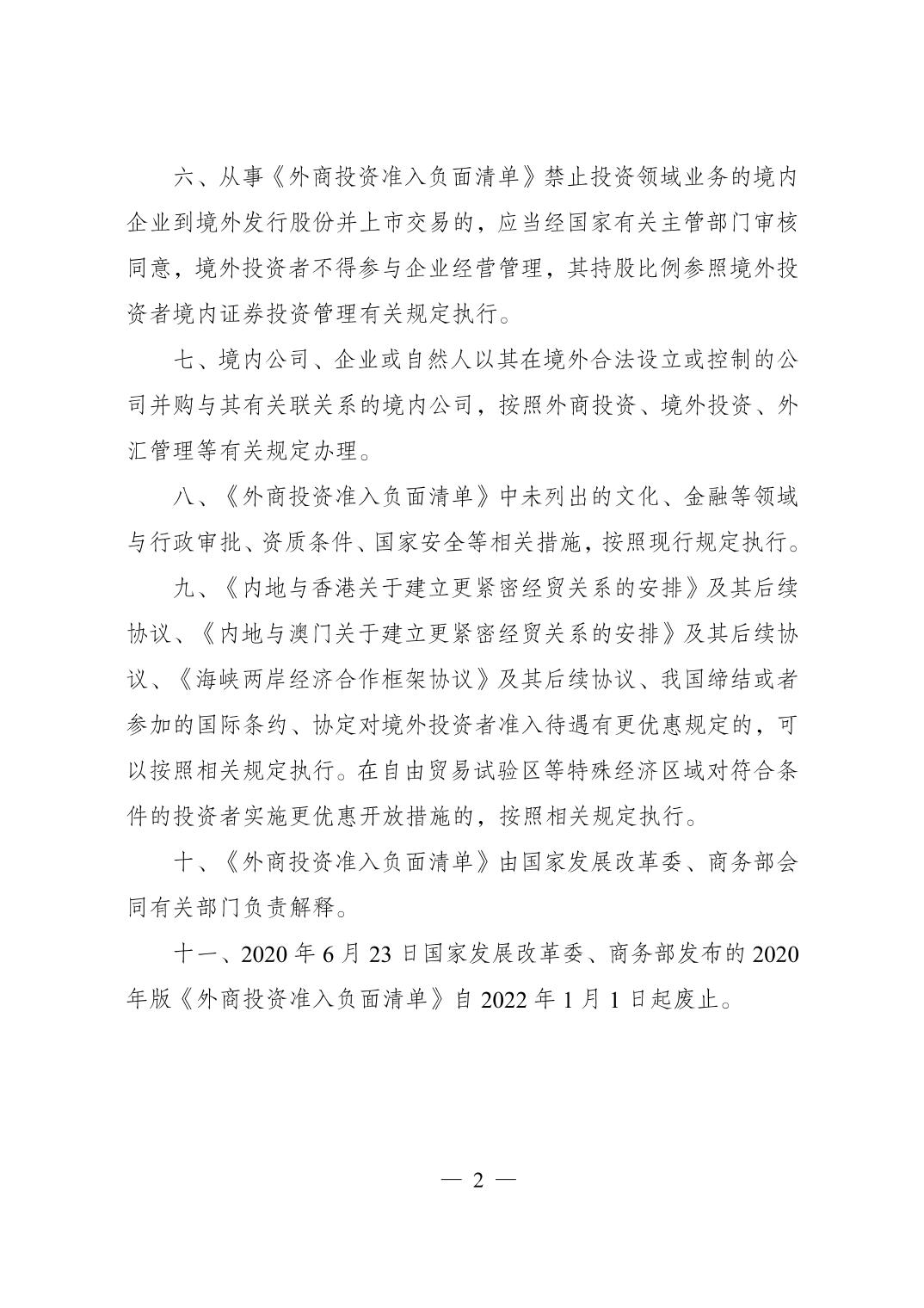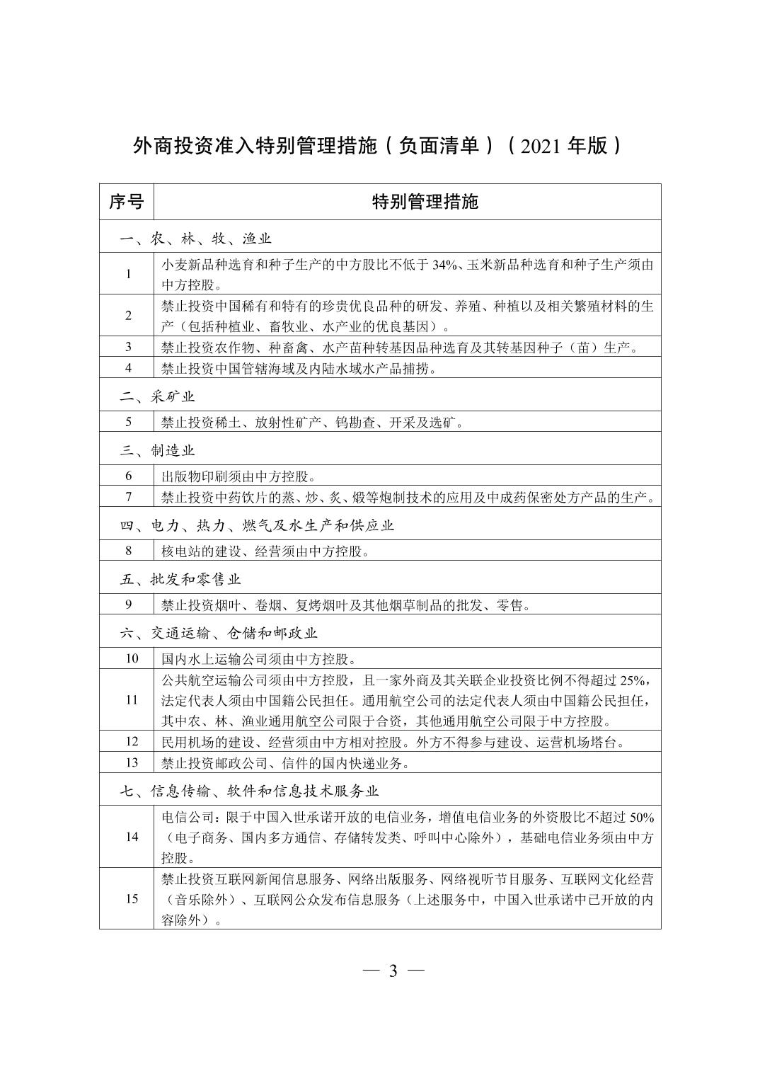 国家发展改革委商务部《外商投资准入特别管理措施(负面清单)(2021年版)》