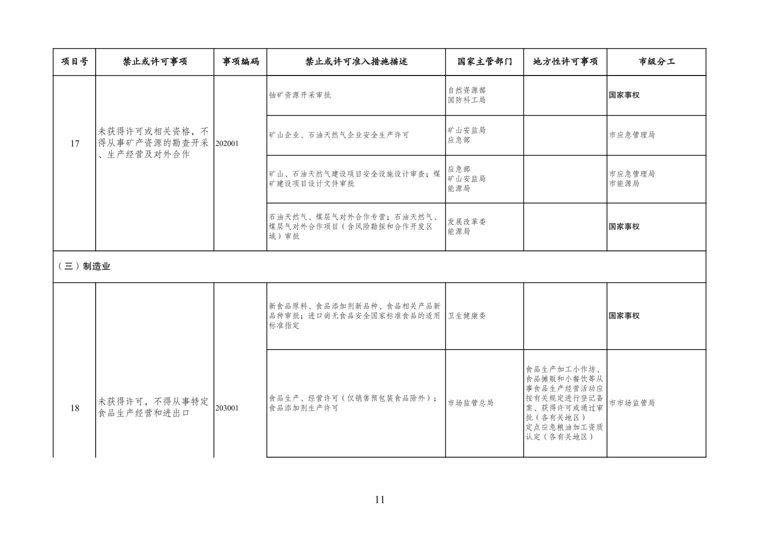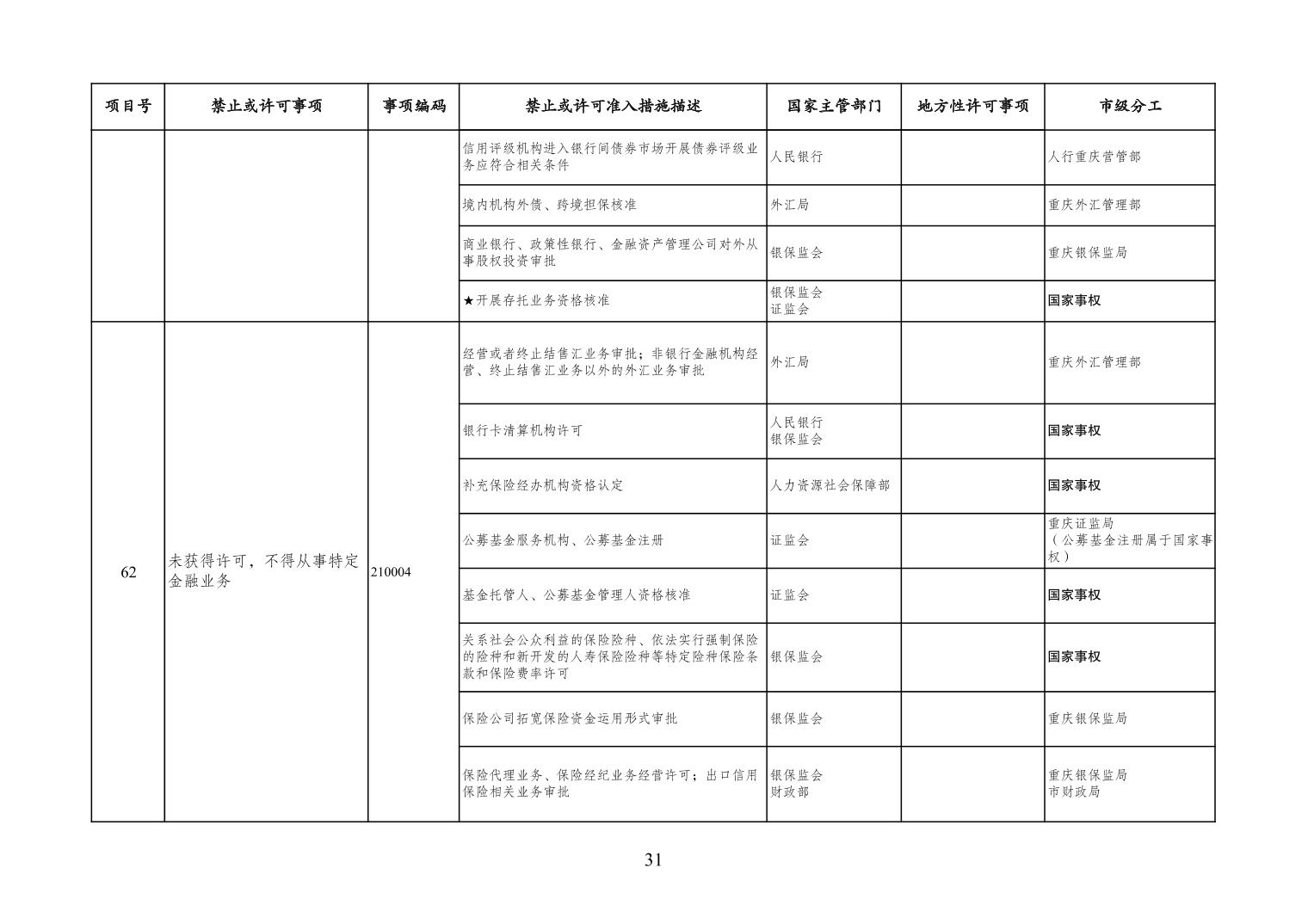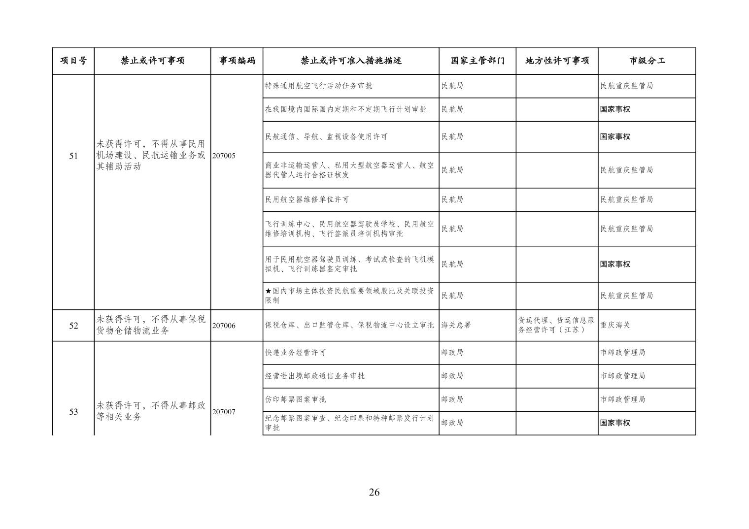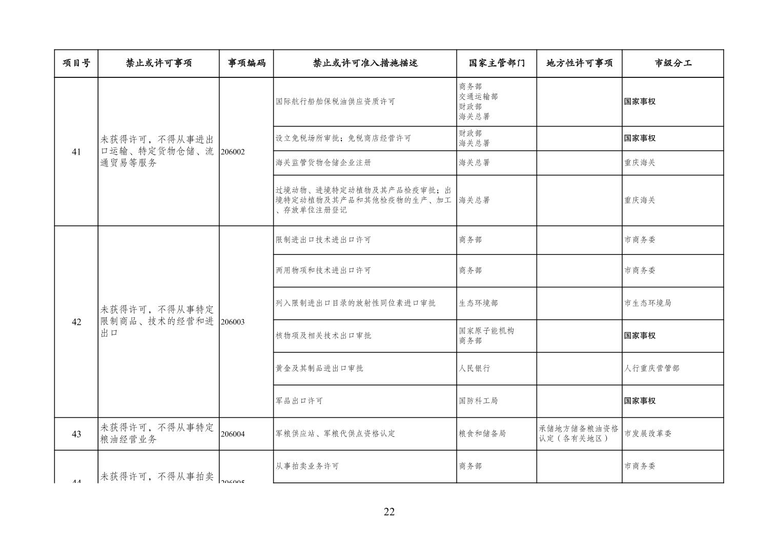 一、严格落实“全国一张清单”管理要求。各区县、各部门不得自行发布具有市场准入性质的负面清单,坚决维护市场准入负面清单制度的统一性、严肃性和权威性,确保“一单尽列、单外无单”。严格落实“非禁即入”要求,对清单之外的行业、领域、业务等,各类市场主体皆可依法平等进入,不得违规另设市场准入行政审批和变相设定准入障碍。对清单所列事项,各区县、各部门要持续优化管理方式,严格规范审批行为,优化审批流程,提高审批效率,正确高效地履行职责。对属于国家事权的准入事项,要做好衔接落实和向市场主体咨询服务工作。