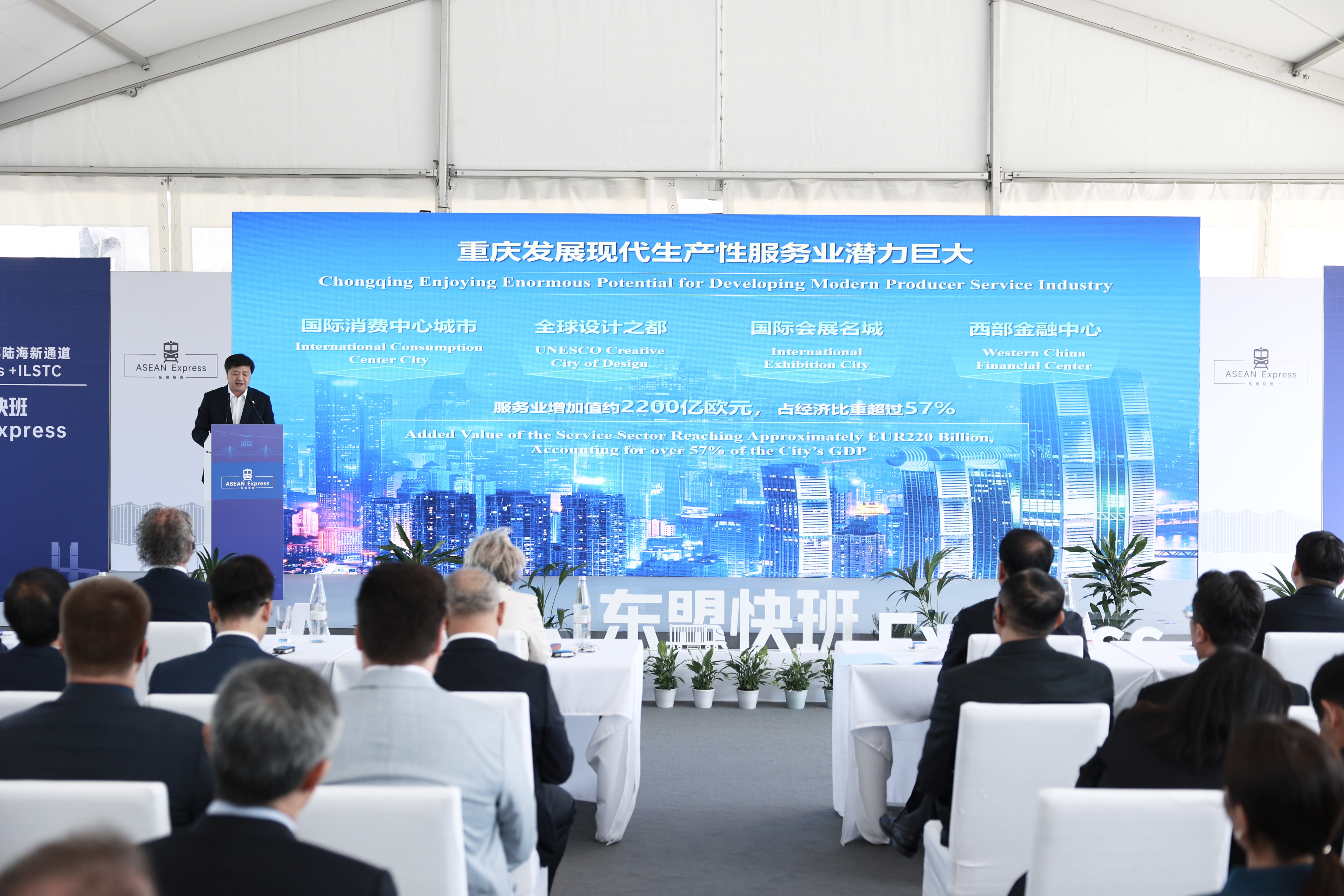 高健重点介绍了重庆与德国在现代生产性服务业领域的合作方向。他指出,目前中欧班列(重庆)已开行直达德国铁路线路4条、在德国境内建立10余个集结分拨点,陆海新通道(重庆)各类铁路联运班列稳定在3600列左右;此次在杜伊斯堡发出的东盟快班,贯通的中欧班列与陆海新通道将成为德国至东盟最快陆上通道。与此密切相关的物流及国际货代、软件信息服务、金融与商务咨询、法律及国际仲裁等现代生产性服务业,迎来了更多的合作发展机会,期待更多德国企业来到中国、投资重庆。
