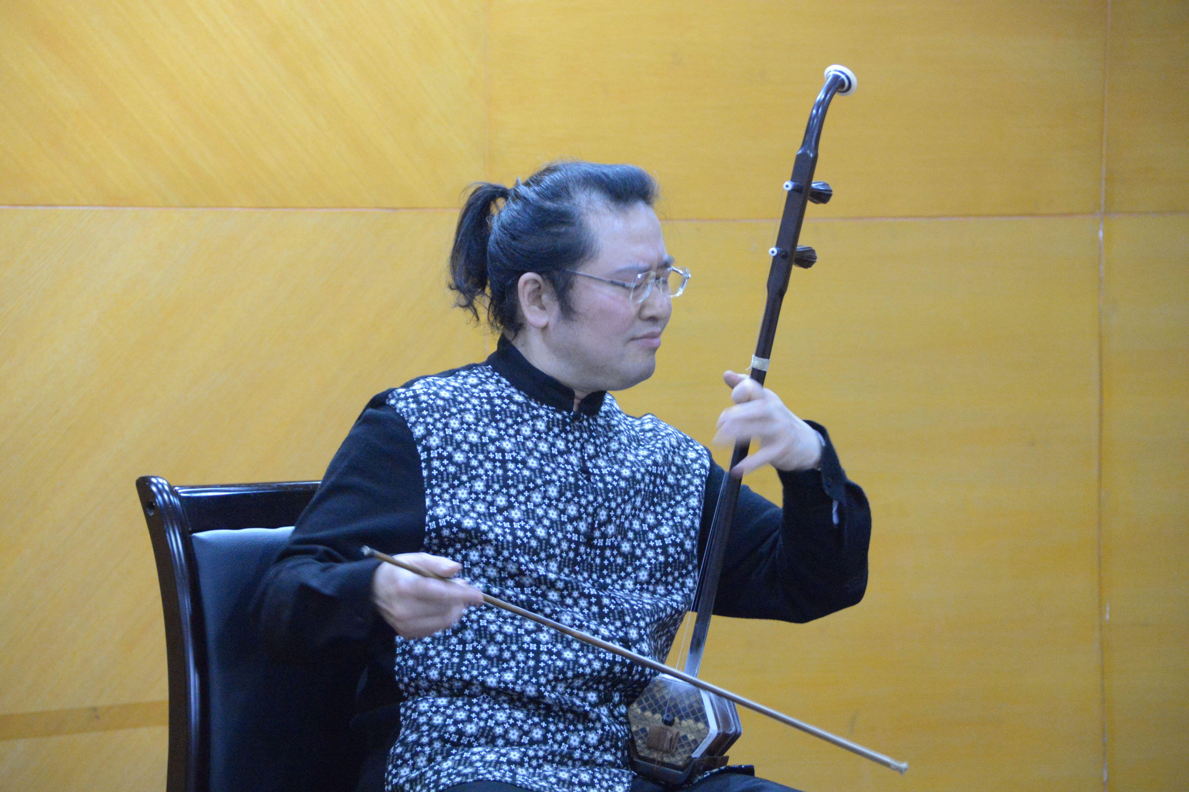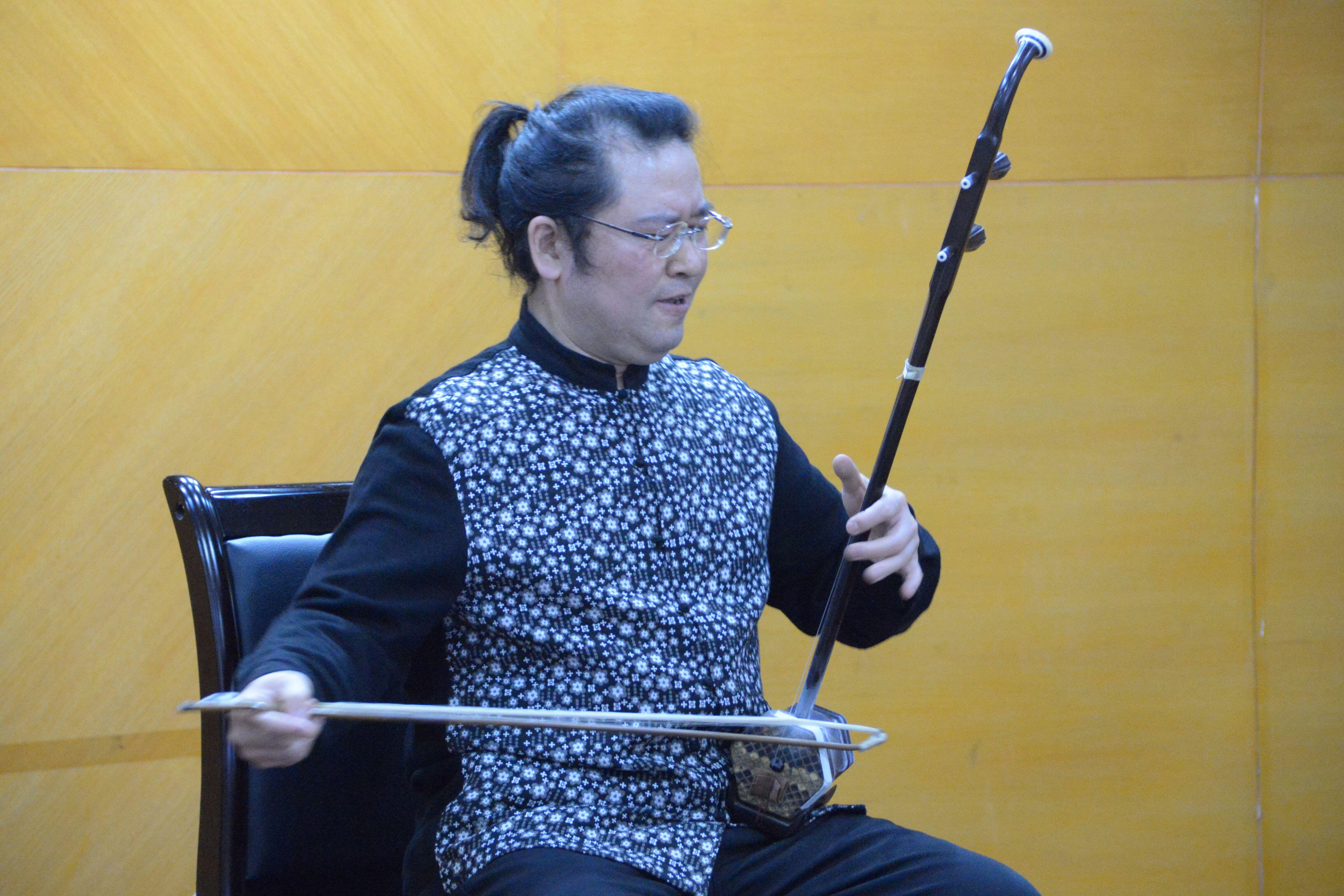 在寓庄于谐、情理交融的讲析之中,刘光宇院长采用边演边讲的独特形式,以其形神兼备的演奏技巧与诙谐风趣的语言动作,将六首著名的二胡名乐行云流水般地演奏出来,馈以在场干部职工,鲜活地展示出二胡艺术源远流长的文化底蕴,灵动地演绎出民乐二胡的非凡艺术魅力。